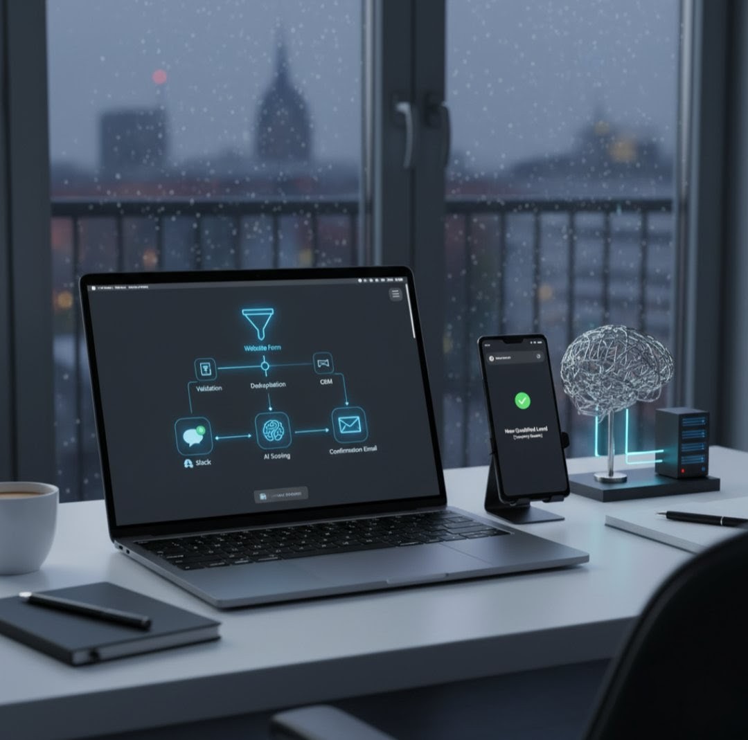 New leads from your website are validated, deduplicated, and logged in your CRM. The system enriches company data with AI, scores lead quality, notifies you in Slack, and sends prospects a confirmation email with next steps and a link to book a call.